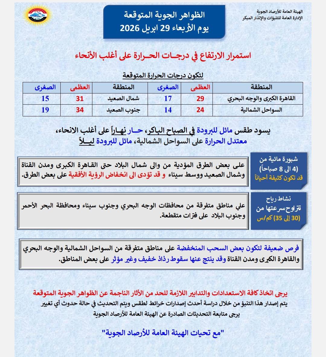 وأشارت هيئة الأرصاد الجوية في بيان لها عبر صفحتها الرسمية على موقع التواصل الاجتماعي فيسبوك، إلى أنه من المتوقع أن يستمر الارتفاع في درجات الحرارة على أغلب أنحاء الجمهورية ليسود طقس مائل للبرودة في الساعات الأولى من الصباح الباكر، ويكون حارًا على أغلب الأنحاء، ومعتدل الحرارة على مناطق السواحل الشمالية ومائل للبرودة في ساعات الليل.