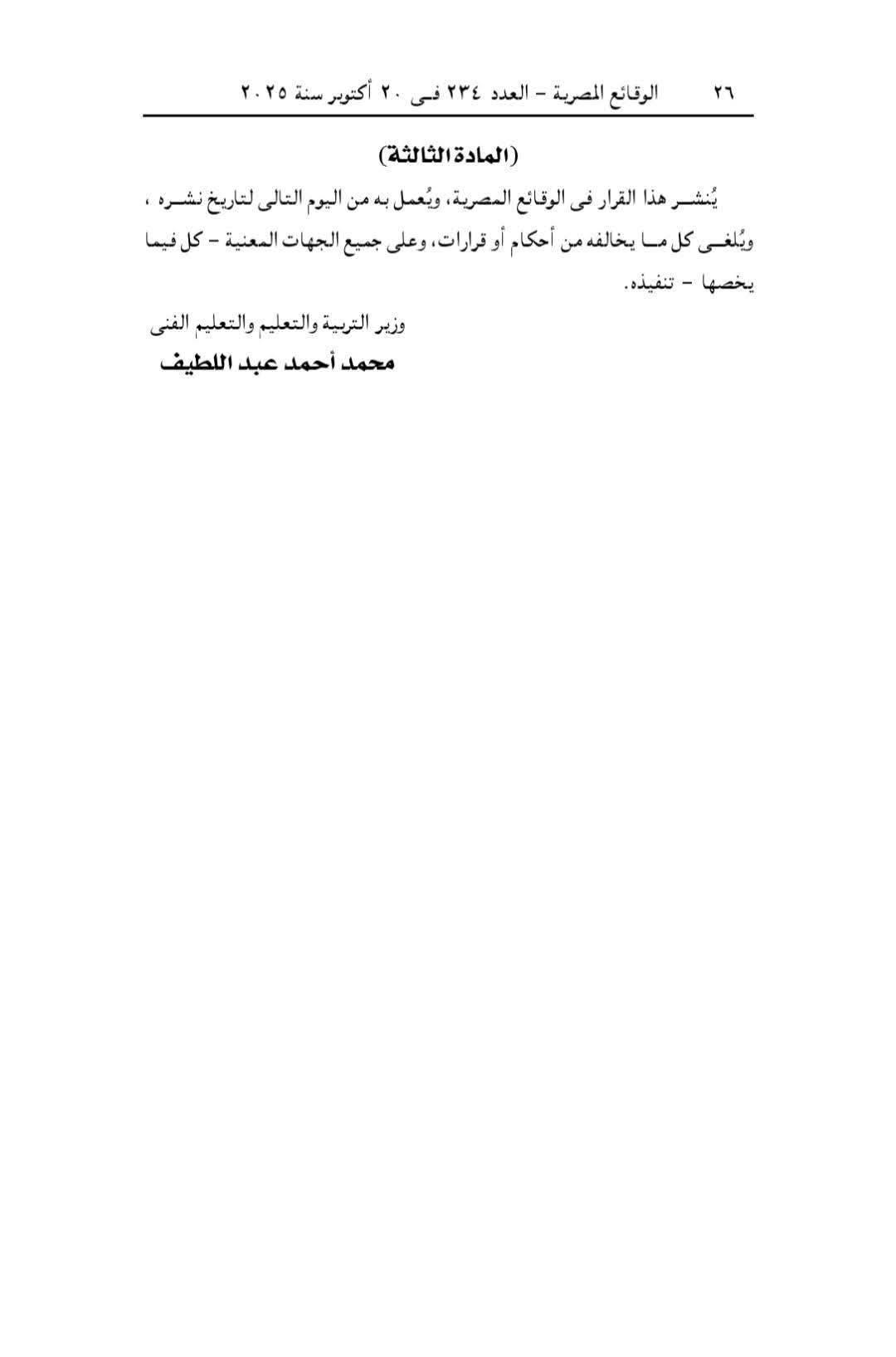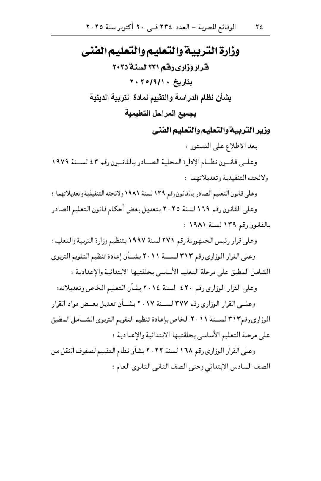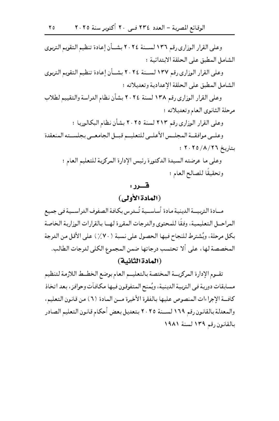 وكلف وزير التربية والتعليم والتعليم الفني، الإدارة المركزية المختصة بالتعليم العام بوضع الخطط اللازمة لتنظيم مسابقات دورية في التربية الدينية، ويمنح المتفوقون فيها مكافآت وحوافز، بعد اتخاذ كافة الإجراءات المنصوص عليها بالفقرة الأخيرة من المادة (٦) من قانون التعليم. والمعدلة بالقانون رقم ١٦٩ لسنة ۲۰۲٥ بتعديل بعض أحكام قانون التعليم الصادر بالقانون رقم ١٣٩ لسنة ۱۹۸۱.