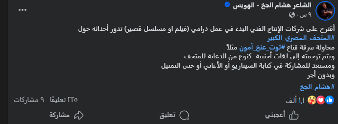 اقترح الشاعر هشام الجخ، على شركات الإنتاج الفني، فكرة تقديم عمل فني عن المتحف المصري الكبير، مشيرا أنه مستعد للمشاركة فيه سواء بالكتابة أو التمثيل بدون أجر.
