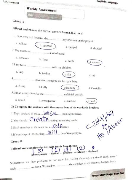 يشمل حل التقييم الأسبوعي إنجليزي أولى إعدادي الوحدة الرابعة ترم أول 2026 الأسئلة والإجابات النموذجية، ومن بينها كان الآتي: