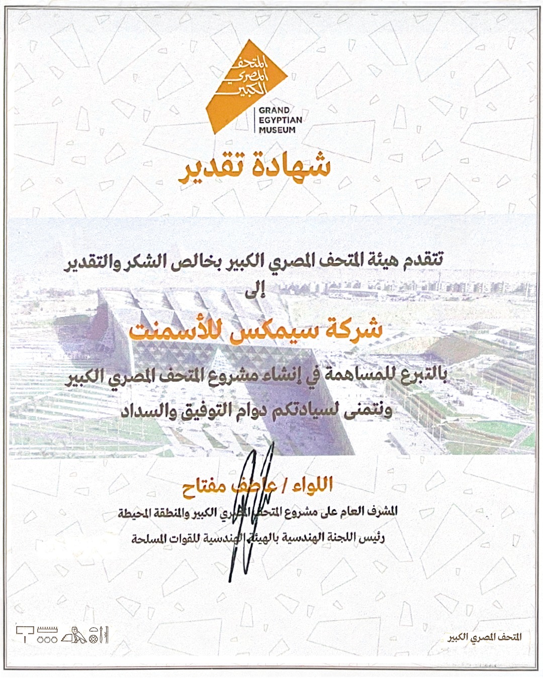 مع فتح المتحف المصري الكبير أبوابه أمام العالم، تفخر سيمكس مصر باستعراض دورها كأحد أوائل الداعمين لهذا المشروع الثقافي الذي يُعد من بين أهم المشاريع في القرن. وتُظهر مشاركة سيمكس في هذا الصرح الوطني التزامها الراسخ تجاه مصر وتراثها ومستقبلها حيث أدركت الشركة الأهمية القصوى للمتحف المصري الكبير منذ المراحل المبكرة لإنشائه.