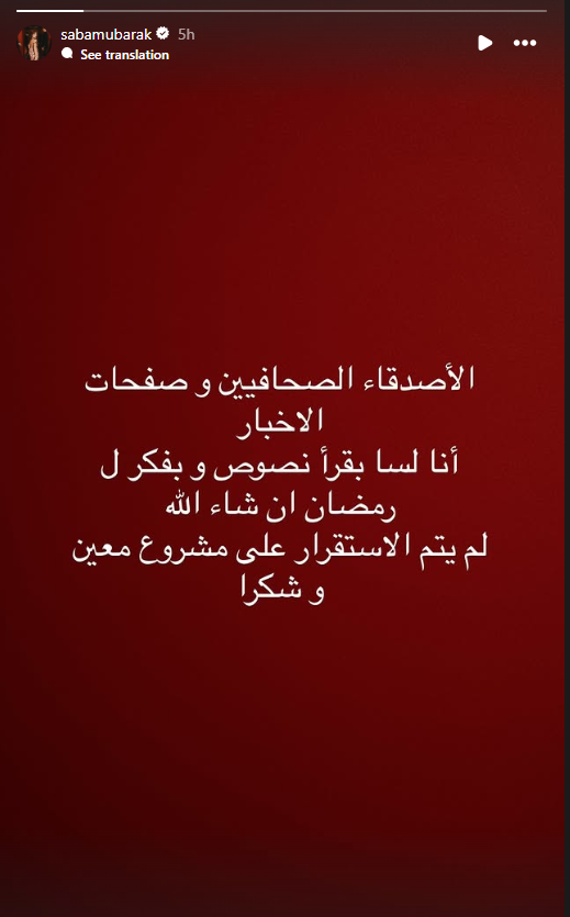 كشفت الفنانة صبا مبارك، عن موقفها من المشاركة في ماراثون مسلسلات رمضان 2026، وذلك بعد انتشار العديد من الأخبار عن استقرارها في عمل معين.