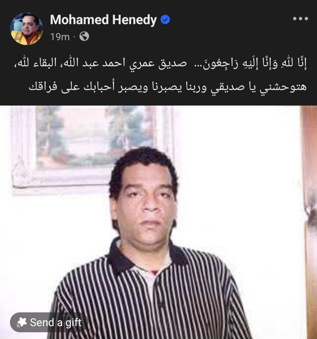 نعى الفنان محمد هنيدي، عبر حسابه الرسمي على مواقع التواصل الاجتماعي، صديقه المقرب والمؤلف الكبير أحمد عبد الله الذي وافته المنية مؤخرًا، قائلاً إنّا لله وإنّا إليه راجعون، صديق عمري أحمد عبد الله، البقاء لله، هتوحشني يا صديقي وربنا يصبرنا ويصبر أحبابك على فراقك.