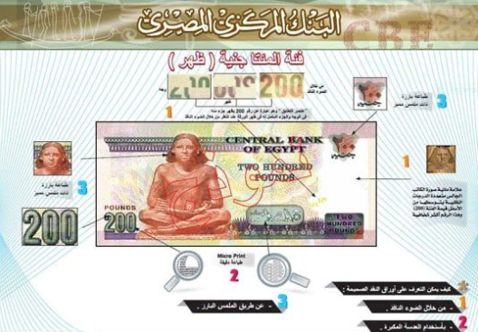 تُعد الورقة النقدية فئة الـ200 جنيه أعلى فئات البنكنوت المصرى، ويحرص البنك المركزى على تحديثها باستمرار ورفع مستويات تأمينها لمواكبة التطور العالمى فى مكافحة التزييف.
