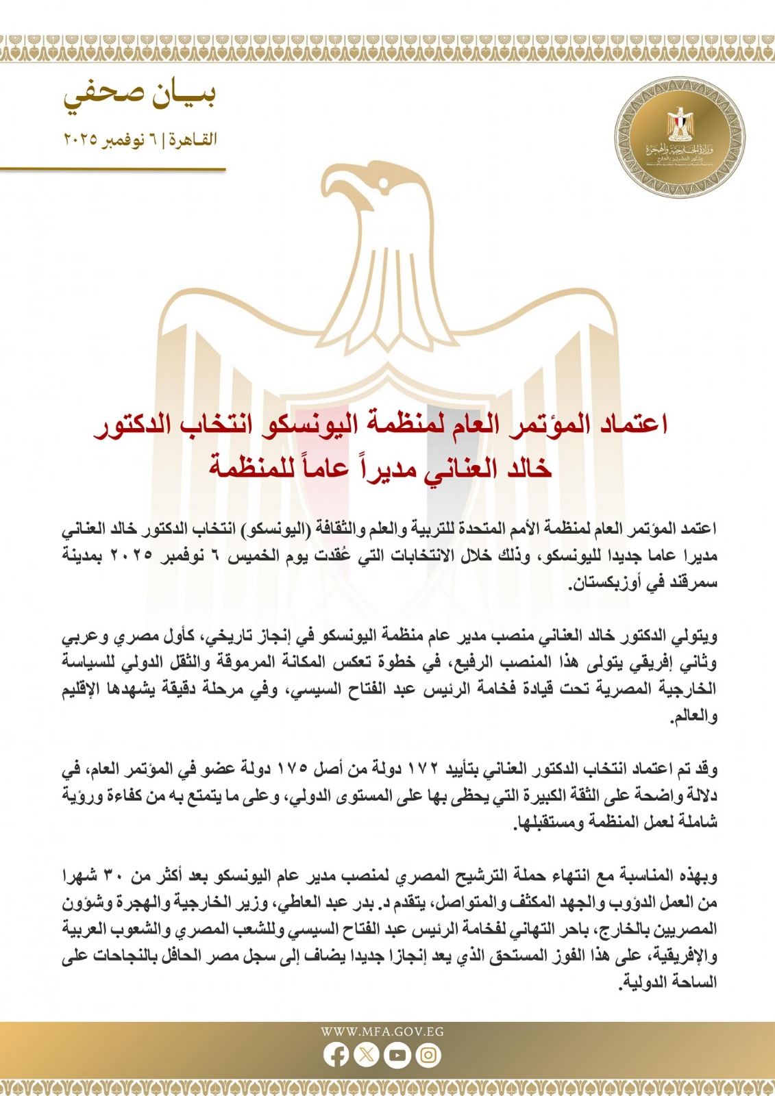أعلن المؤتمر العام لمنظمة الأمم المتحدة للتربية والعلم والثقافة (اليونسكو) اعتماد انتخاب الدكتور خالد العناني مديرا عاما جديدا للمنظمة، وذلك خلال الانتخابات التي جرت يوم الخميس 6 نوفمبر 2025 بمدينة سمرقند في أوزبكستان.