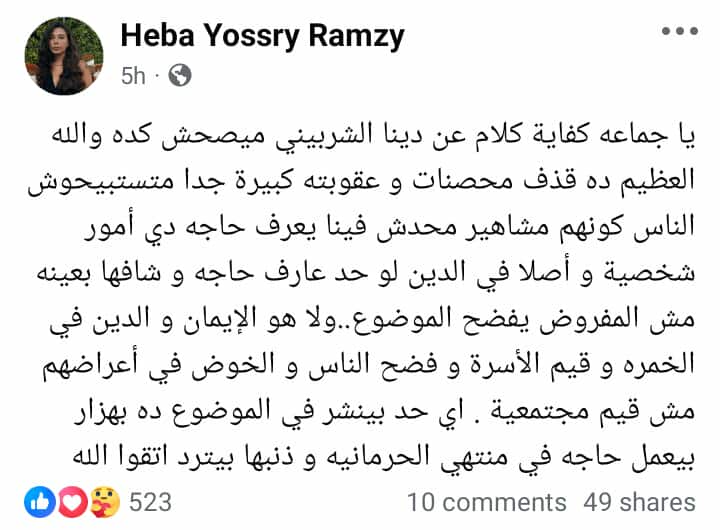 وتابعت هبة يسري حديثها: ولا هو الإيمان و الدين في الخمره و قيم الأسرة و فضح الناس و الخوض في أعراضهم مش قيم مجتمعية . اي حد بينشر في الموضوع ده بهزار بيعمل حاجه في منتهي الحرمانيه و ذنبها بيترد اتقوا الله.