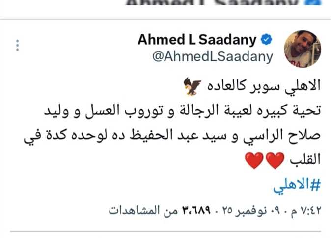 تحية للاعيبة الرجالة.. أحمد السعدني يحتفل بفوز الأهلي بكأس السوبر المصري
