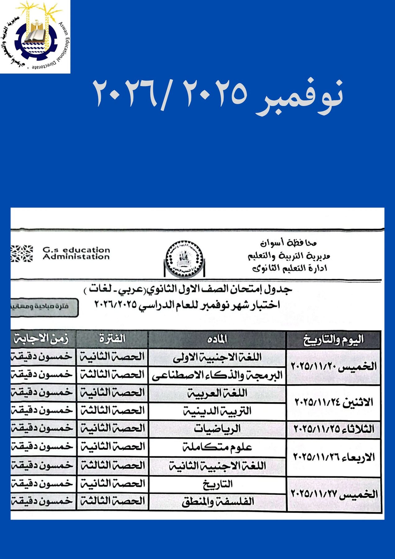 أما جدول امتحان الصف الثاني الثانوي بشهر نوفمبر 2025 بمحافظة أسوان فجاء كالتالي: