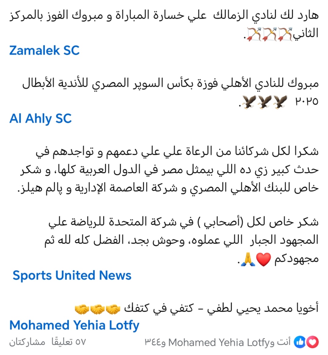 واختتم المهندس سيف الوزيري منشوره بتوجيه شكر خاص إلى زميله الأستاذ محمد يحيى لطفي، رئيس مجلس إدارة شركة المتحدة للرياضة، معبراً عن روح التعاون والصداقة بينهما قائلاً: “أخويا محمد يحيى لطفي، كتفي في كتفك”.