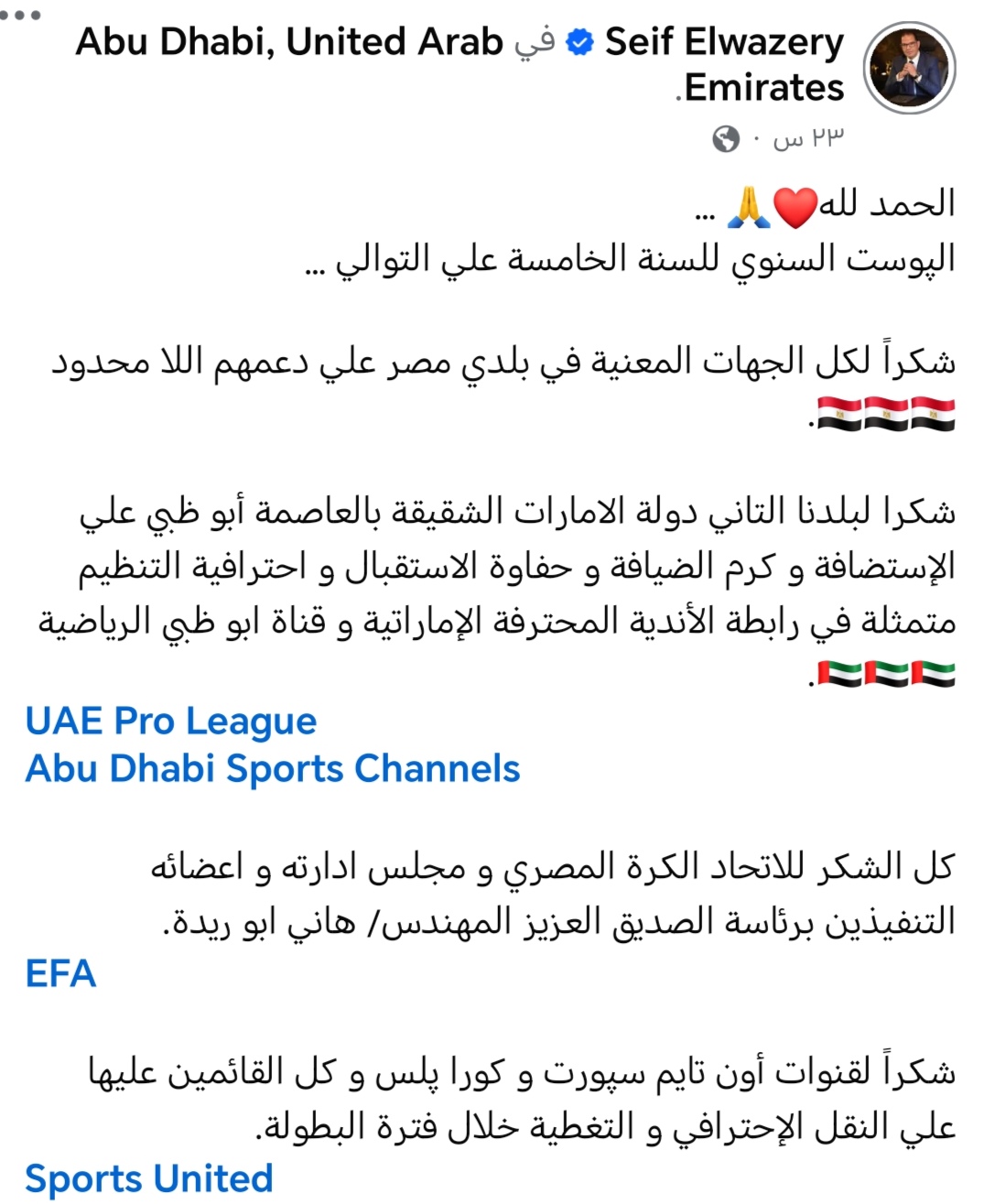 واستهل الوزيري منشوره قائلاً: “الحمد لله… البوست السنوي للسنة الخامسة على التوالي، شكراً لكل الجهات المعنية في بلدي مصر على دعمهم اللامحدود”، مؤكداً امتنانه للدعم الكبير الذي تحظى به الرياضة المصرية من مختلف المؤسسات داخل الدولة.