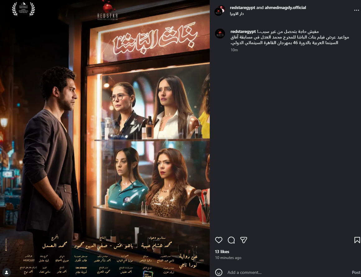 روج الفنان أحمد مجدي، لـ فيلمه الجديد، الذي يأتي بعنوان بنات الباشا، والمقرر أن يتم عرضه في فعاليات مهرجان القاهرة السينمائي في دورته الـ 46، المقرر ان تنتطلق غدا الأربعاء.