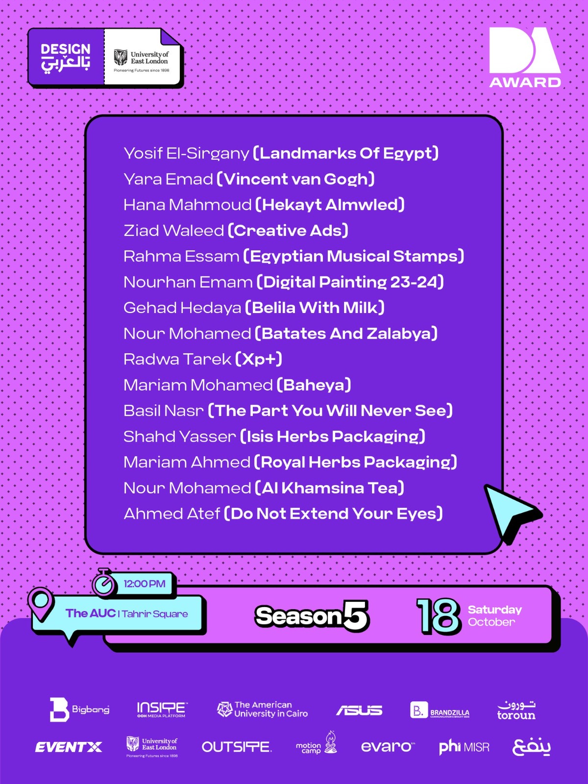 وقد جاءت مشاركات طلاب قسم الإعلان والإعلان الرقمي لتعكس تنوع الفكر والرؤية الفنية المبتكرة، حيث شارك كل من رضوى طارق قسم إعلان، وأميرة قسم إعلان، وزياد وليد الفرقة الثانية، إعلان رقمي، الذين قدموا أعمالًا عكست وعيًا فنيًا معاصرًا وقدرة على توظيف أدوات التصميم الجرافيكي في التعبير عن أفكار إبداعية ذات طابع عربي مميز.