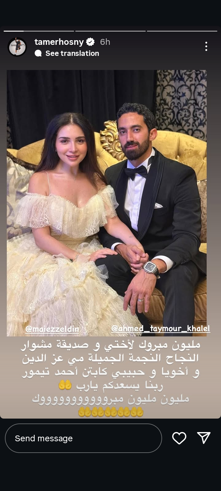كما حرص تامر حسني على تهنئة مي عز الدين أيضا بزواجها من أحمد تيمور، حيث كان من بين الأشخاص الذي كان يتمنى الجمهور ارتباطهم في الحقيقة، خاصة بعد سلسلة فيلم عمر وسلمى، فكتب: مليون مبروك لاختي وصديقة مشوار النجاح، النجمة الكبيرة مي عز الدين وأخويا الكابتن أحمد تيمور.. ربنا يسعدكم يارب ومليون مبروك.