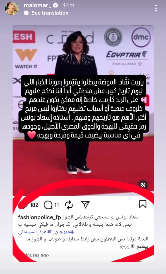 خرجت الفنانة مي عمر لتعبّر عن استيائها من الانتقادات الموجهة لصاحبة السعادة إسعاد يونس بسبب إطلالتها في مهرجان القاهرة السينمائي الدولي، مؤكدة أن مكانة إسعاد يونس الفنية والإنسانية لا يجوز أن تُختزل في تقييم مظهر أو إطلالة.