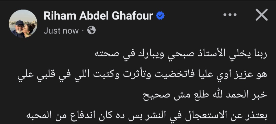 قدمت الفنانة ريهام عبد الغفور اعتذارها للجمهور وللفنان محمد صبحي، بعد نشرها خبر وفاة الأخير الذي تبين لاحقًا أنه غير صحيح.
