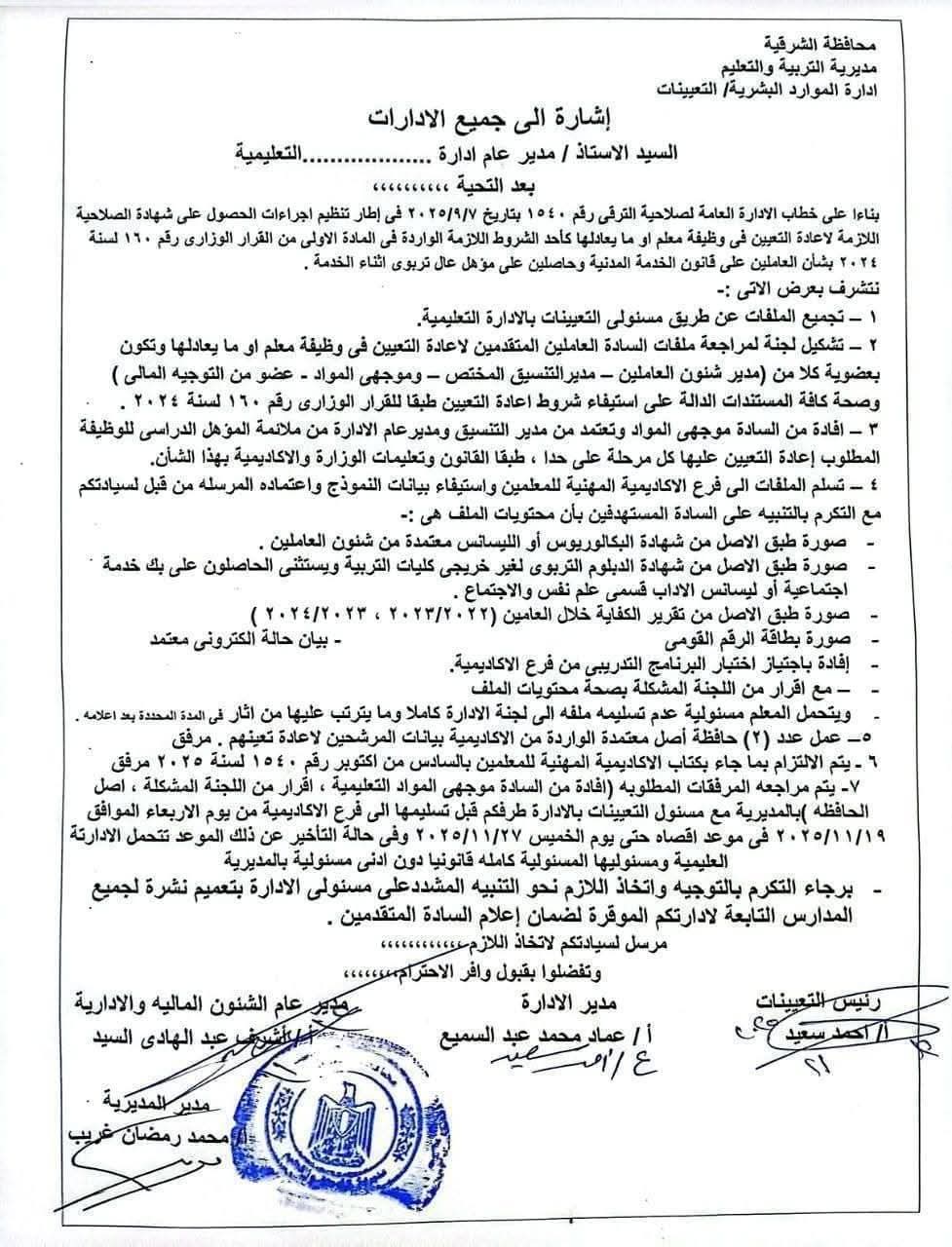 - إقرار من اللجنة المشكلة، أصل الحافظة بالمديرية مع مسئول التعيينات بالإدارة قبل تسليمها إلى فرع الأكاديمية من يوم الأربعاء الموافق ۲۰۲۵/۱۱/۱۹ في موعد أقصاه حتى يوم الخميس ۲۰۲۵/۱۱/۲۷.