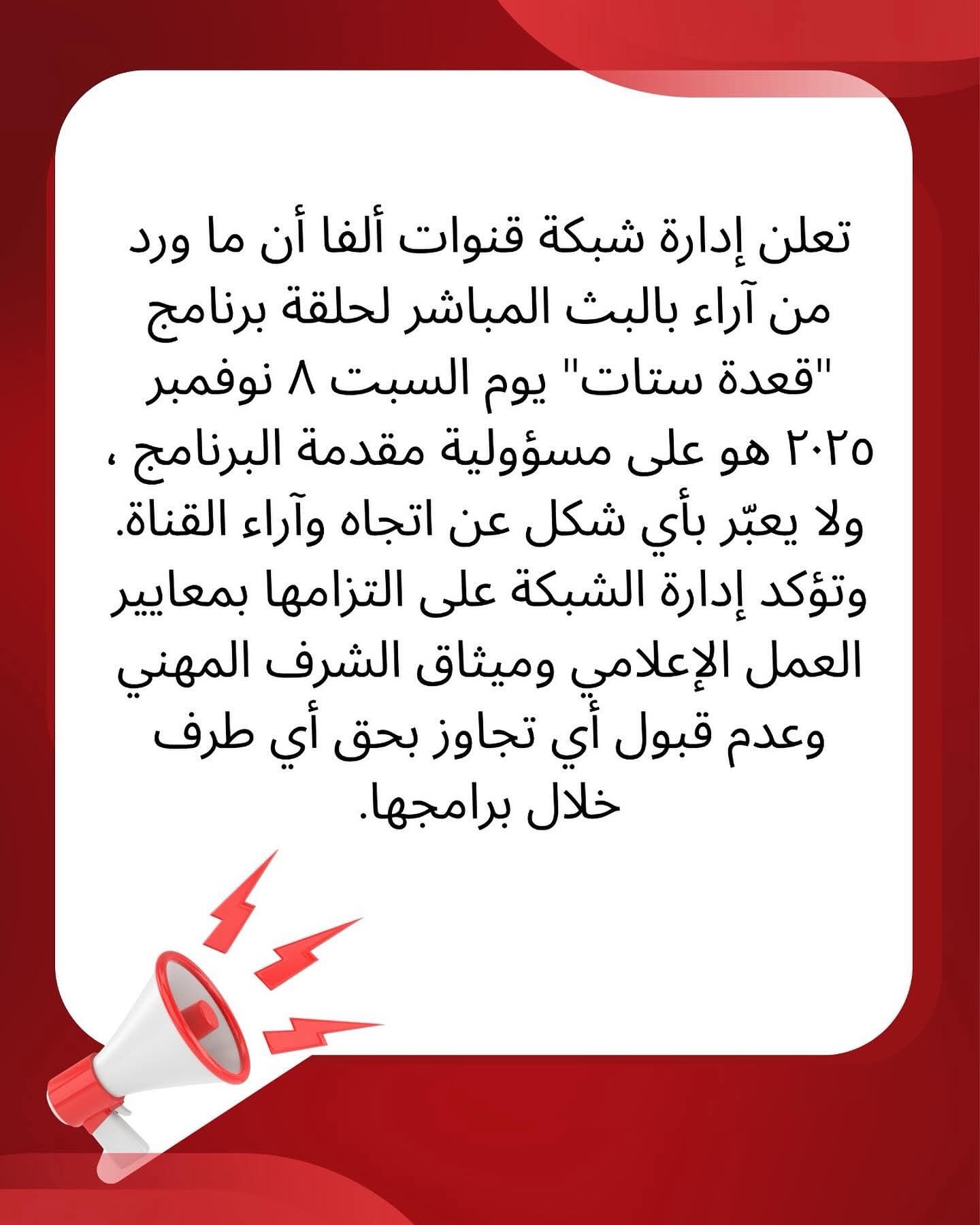 إدارة قنوات ألفا تتبرأ من تصريحات مروة صبري عن دينا الشربيني
