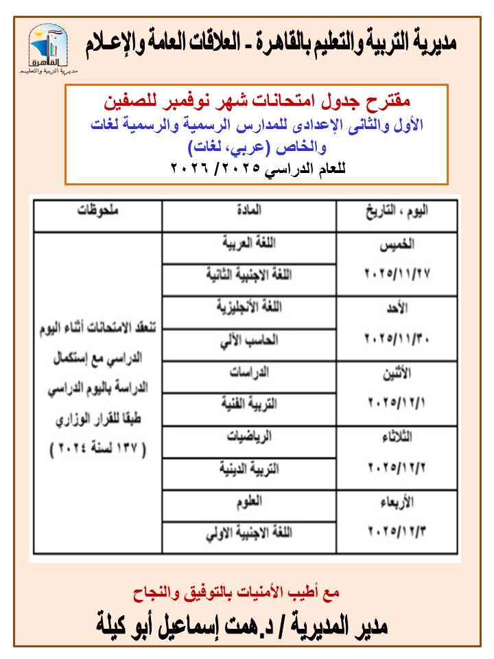 ويمكن الحصول على جداول امتحانات شهر نوفمبر 2025 لطلاب صفوف النقل بالقاهرة من خلال مطالعة الصور التالية: