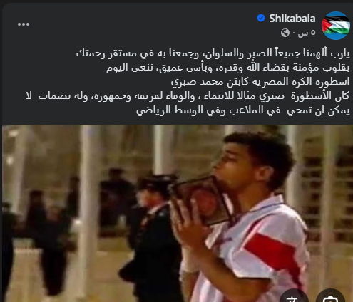 وكتب شيكابالا عبر فيس بوك، يارب ألهمنا جميعاً الصبر والسلوان، وجمعنا به في مستقر رحمتك، بقلوب مؤمنة بقضاء الله وقدره، وبأسى عميق، ننعى اليوم أسطوره الكرة المصرية كابتن محمد صبري.