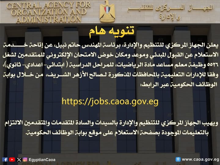 أعلن الجهاز المركزي للتنظيم والإدارة، برئاسة المهندس حاتم نبيل، عن إتاحة خدمة الاستعلام عن القبول المبدئي وموعد ومكان خوض الامتحان الإلكتروني للمتقدمين لشغل ٥٥٢٦ وظيفة معلم مساعد مادة الرياضيات للمراحل الدراسية ( ابتدائي – إعدادي – ثانوي).