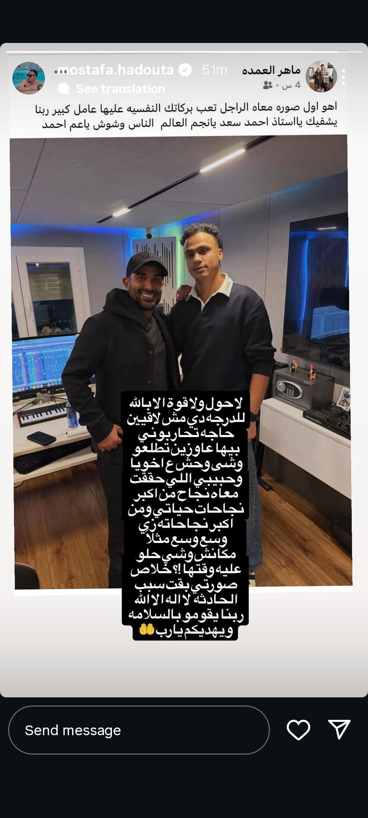 ليرد مصطفى حدوتة عليه، قائلا: للدرجادي مش لاقين حاجة تحاربوني بيها، عايزين تطلعوا وشي وحش على أخويا وحبيبي اللي حققت معاه نجاح من أكبر نجاحات حياتي وأكبر نجاحاته، زي وسع وسع مثلا، مكنش وشي حلو عليه؟ خلاص صورتي بقت سبب الحادثة، لا اله إلا الله، ربنا يقومه بالسلامة ويهديكم.