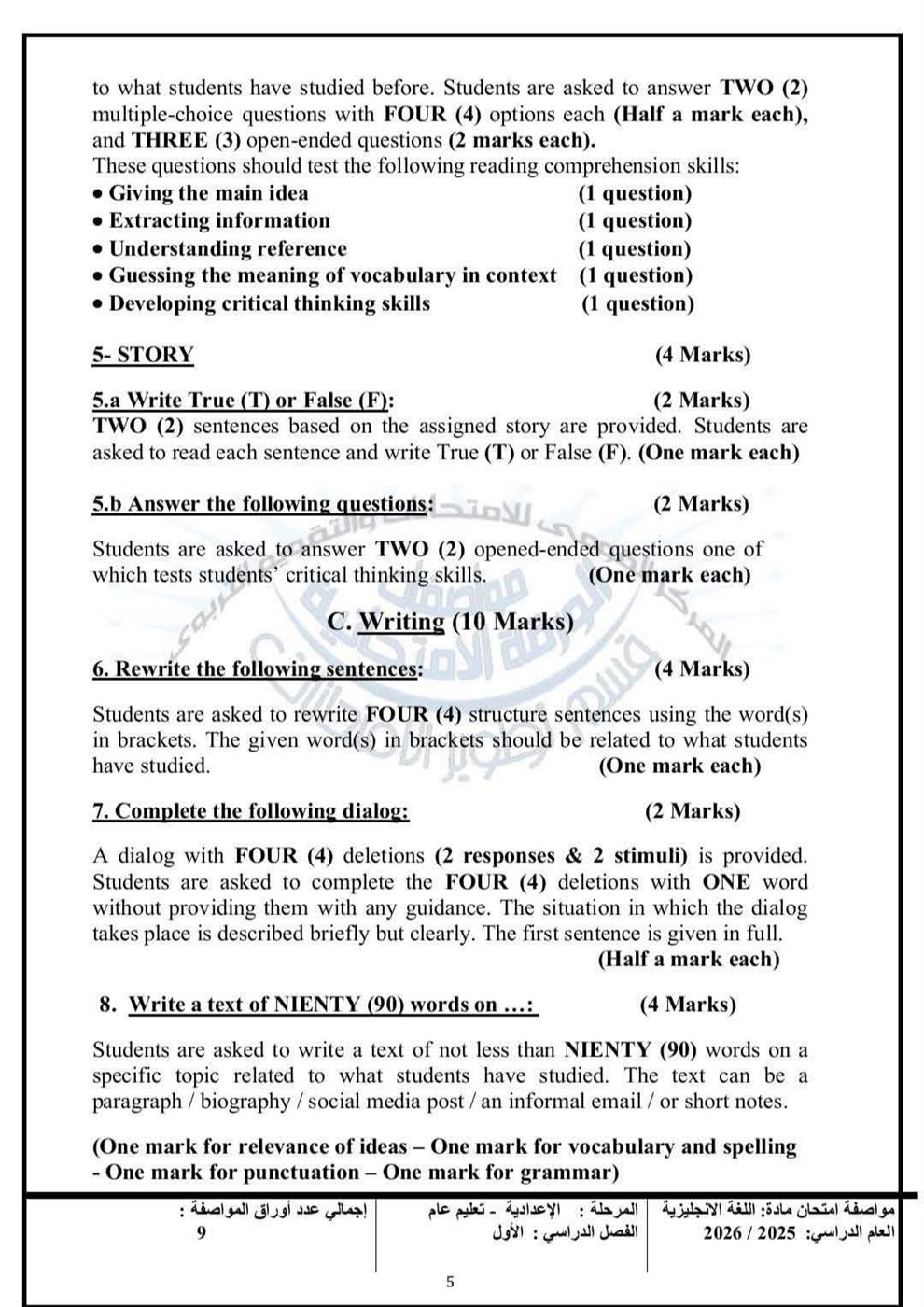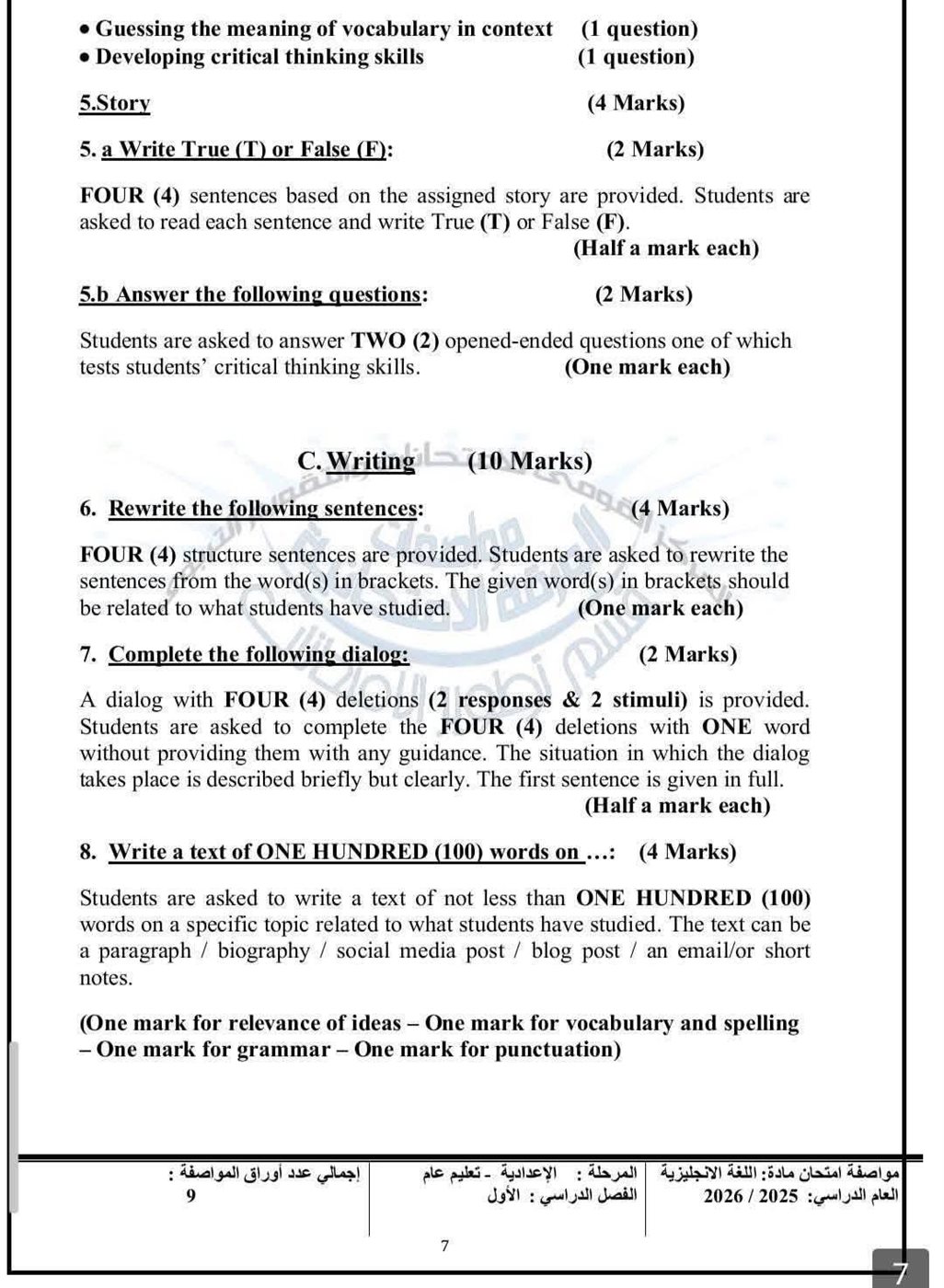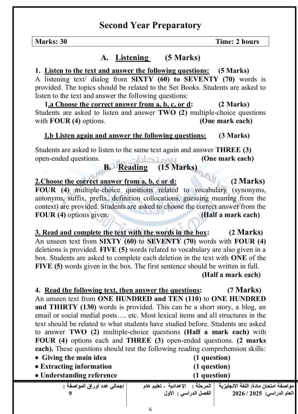 وجاءت مواصفات امتحان اللغة الإنجليزية لطلاب الإعدادية 2026 للصفوف الأول والثاني والثالث الإعدادي الترم الأول كالآتي: