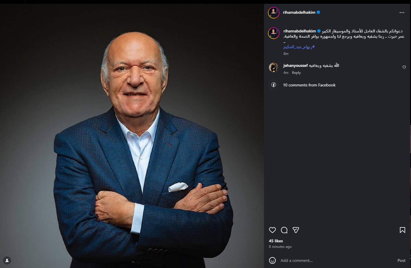 حرصت الفنانة ريهام عبد الحكيم، على الدعاء، للموسيقار عمر خيرت، وذلك بعد أن تعرض لنزلة برد شديدة نقل على إثرها للعناية المركزة خلال الساعات الماضية.