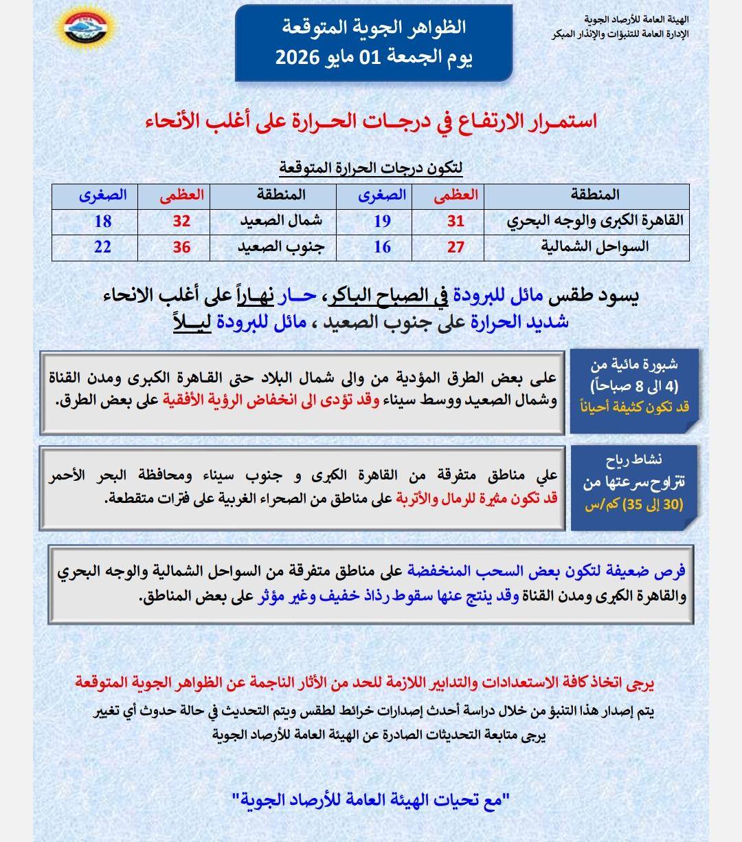 كشفت الهيئة العامة للأرصاد الجوية، تفاصيل حالة الطقس المتوقعة للساعات المقبلة لغد الجمعة الموافق الـ 1 من شهر مايو 2026، حيث يشير الخبراء إلى أنه من المتوقع أن يكون هناك استمرار لارتفاع درجات الحرارة على أغلب الأنحاء، مع وجود استمرار لعدد من الظواهر مثل الشبورة المائية الصباحية ونشاط للرياح.