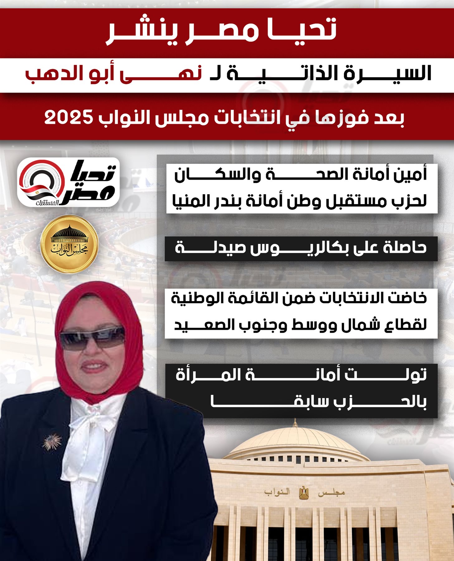 تحيا مصر ينشر السيرة الذاتية لـ نهى أبو الدهب بعد فوزها في انتخابات مجلس النواب 2025