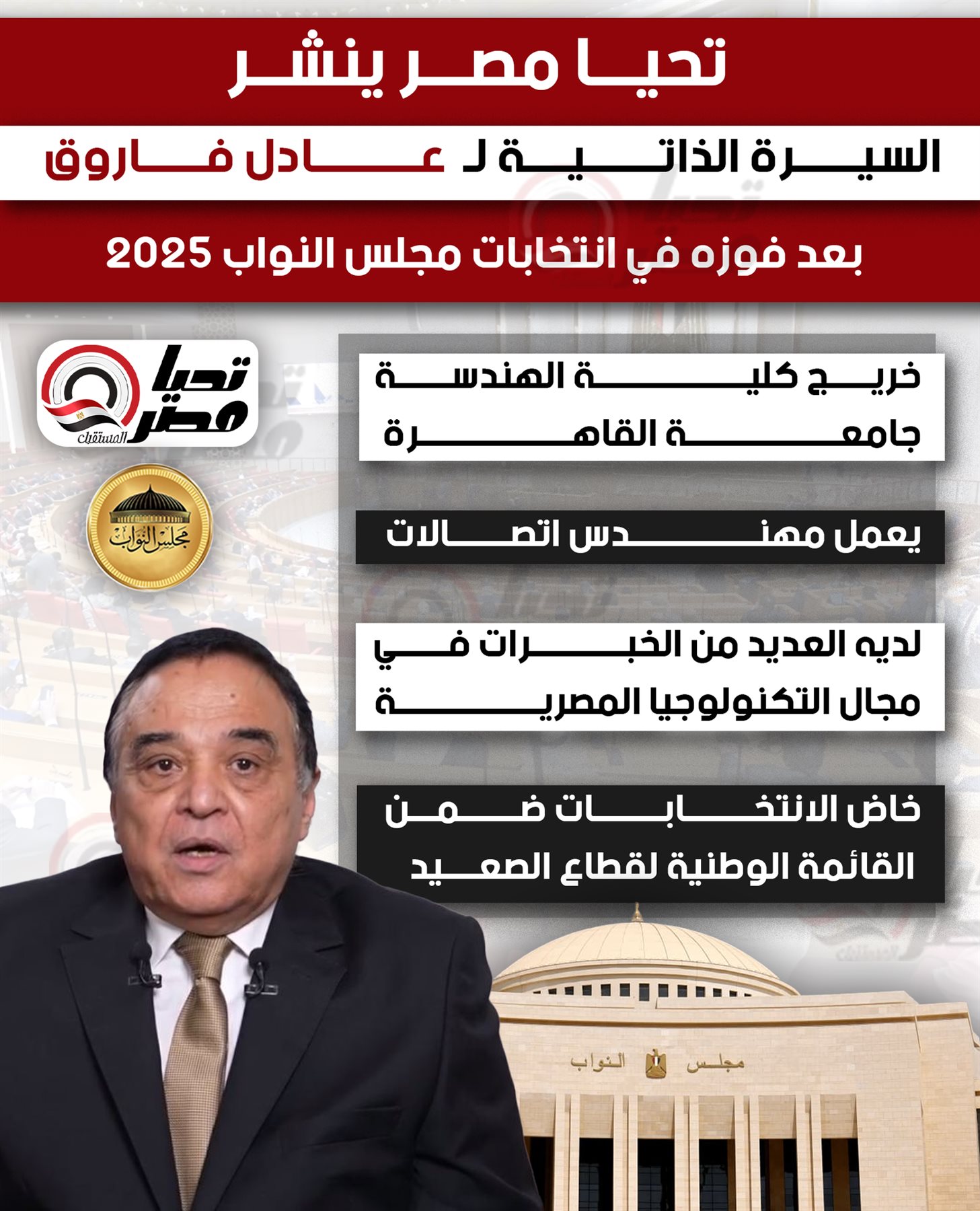 تحيا مصر ينشر السيرة الذاتية لـ عادل فاروق بعد فوزه في انتخابات مجلس النواب 2025