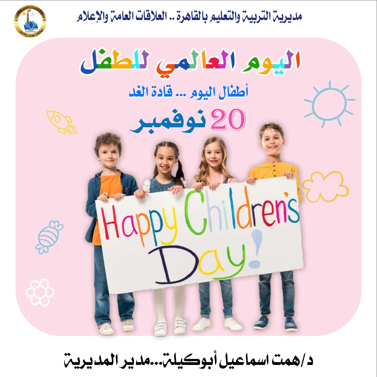 تحتفل مديرية التربية والتعليم بالقاهرة، اليوم الخميس، برعاية الدكتورة همت أبوكيلة، مدير المديرية، “باليوم العالمى للطفل”، والذى يوافق ٢٠ نوفمبر من كل عام.