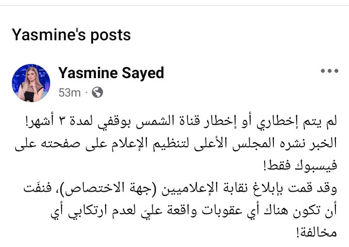 وتابعت ياسمين الخطيب: قد قمت بإبلاغ نقابة الإعلاميين (جهة الاختصاص)، فنفَت أن تكون هناك أي عقوبات واقعة عليّ لعدم ارتكابي أي مخالفة!.