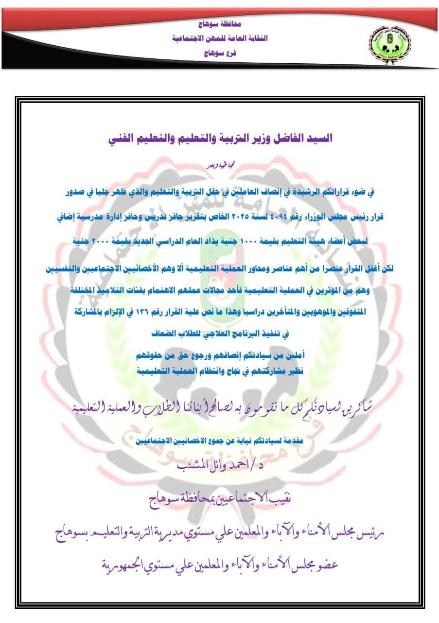 وطالبوا بتعديل القرار التنفيذي ليشملهم ضمن المستفيدين، مراعاةً لدورهم الحيوي في دعم العملية التعليمية وتحقيق الاستقرار داخل المدارس، مؤكدين أن الاعتراف بمجهوداتهم سيكون خطوة مهمة نحو رفع جودة الخدمات التعليمية المقدمة للطلاب.