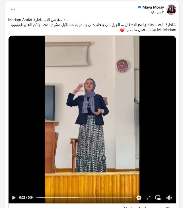 حيث الدكتورة مايا مرسي، وزيرة التضامن الاجتماعي، عبر منشور على موقع التواصل الاجتماعي فيسبوك، بأداء المعلمة مريم عرفات، إحدى معلمات مدارس الإسماعيلية، التي لفتت الأنظار بتفانيها في التدريس واستخدامها المميز للغات الإشارة في تواصلها مع الأطفال، خاصة ذوي الإعاقة السمعية.