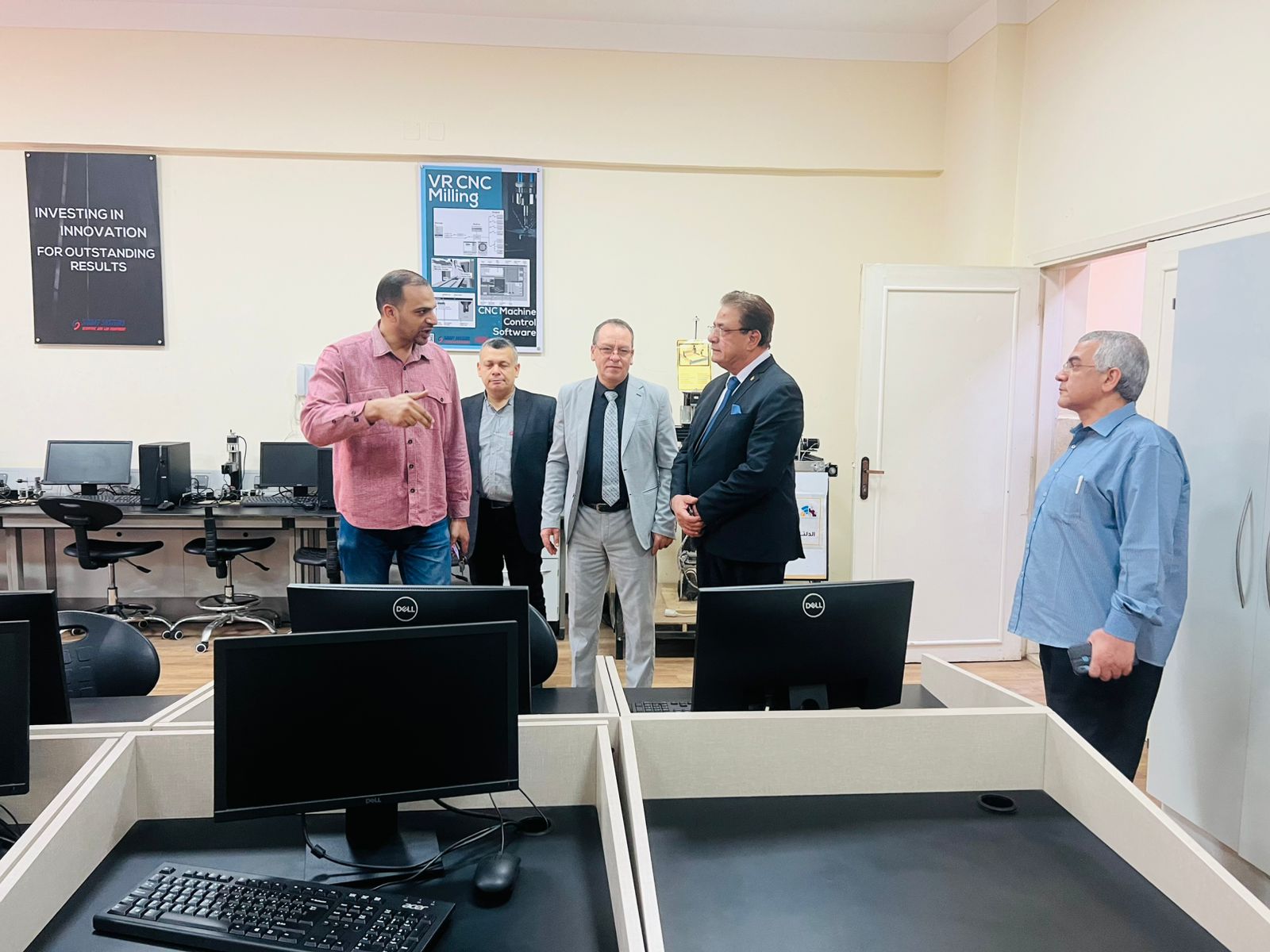 تضمنت الزيارة جولة تفقدية شملت عددًا من المعامل الموجودة بالجامعة، المدرجات، وقاعة الإختبارات الإلكترونية، كان فى استقبالهم الدكتور محمد عزت وكيل الكلية لشئون التعليم والطلاب، والدكتور عمرو عبدالهادي وكيل الكلية لشئون الدراسات العليا والبحوث،والذى اشاد بالتجهيزات والإمكانيات التكنولوجية والتقنية الموجودة.