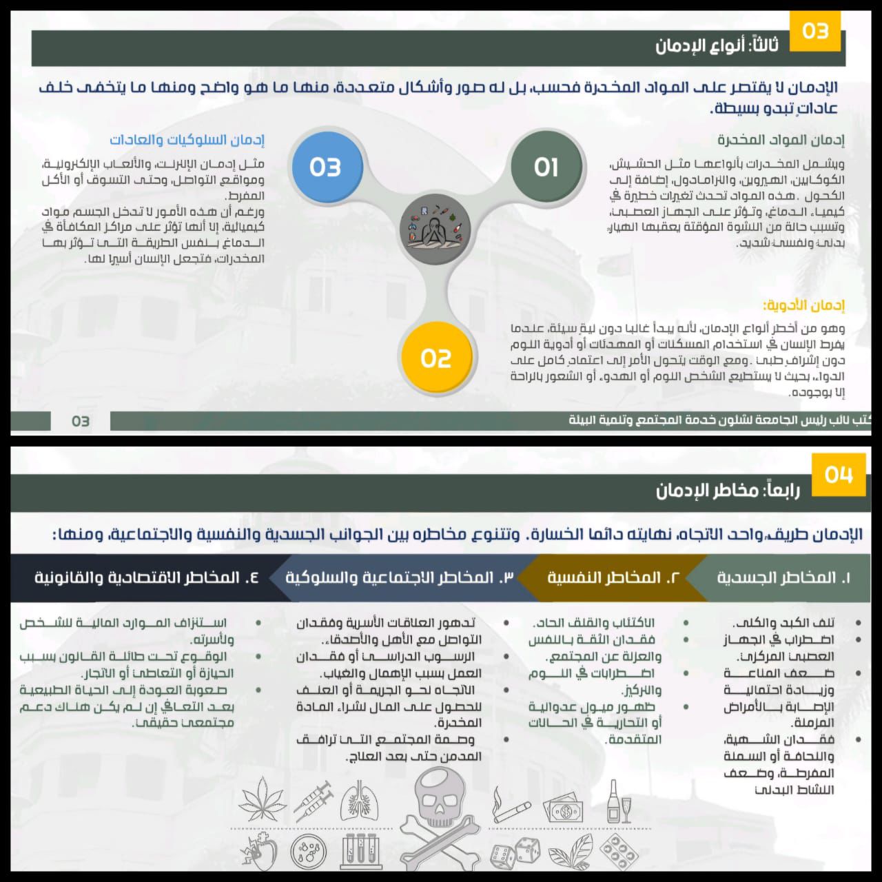 وتطرق التقرير، إلى تتظيم قسم الجلدية بكلية طب قصر العيني ندوة توعوية تحت شعار “لا للمخدرات” حاضر فيها مجموعة من المدرسين المساعدين المتخصصين في الأمراض الجلدية، وهم: الدكتورة منار سعيد، الدكتورة يمنى عاصم، والدكتورة هدير خضر.، كما صمم قسم الصحة العامة وطب المجتمع ملصقا ركز على توضيح مخاطر الادمان وتأثيرها على الصحة الجسدية والنفسية.