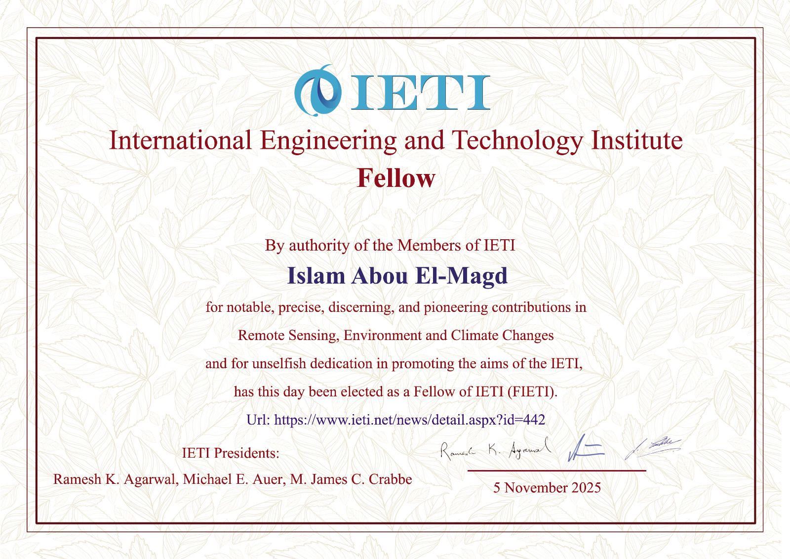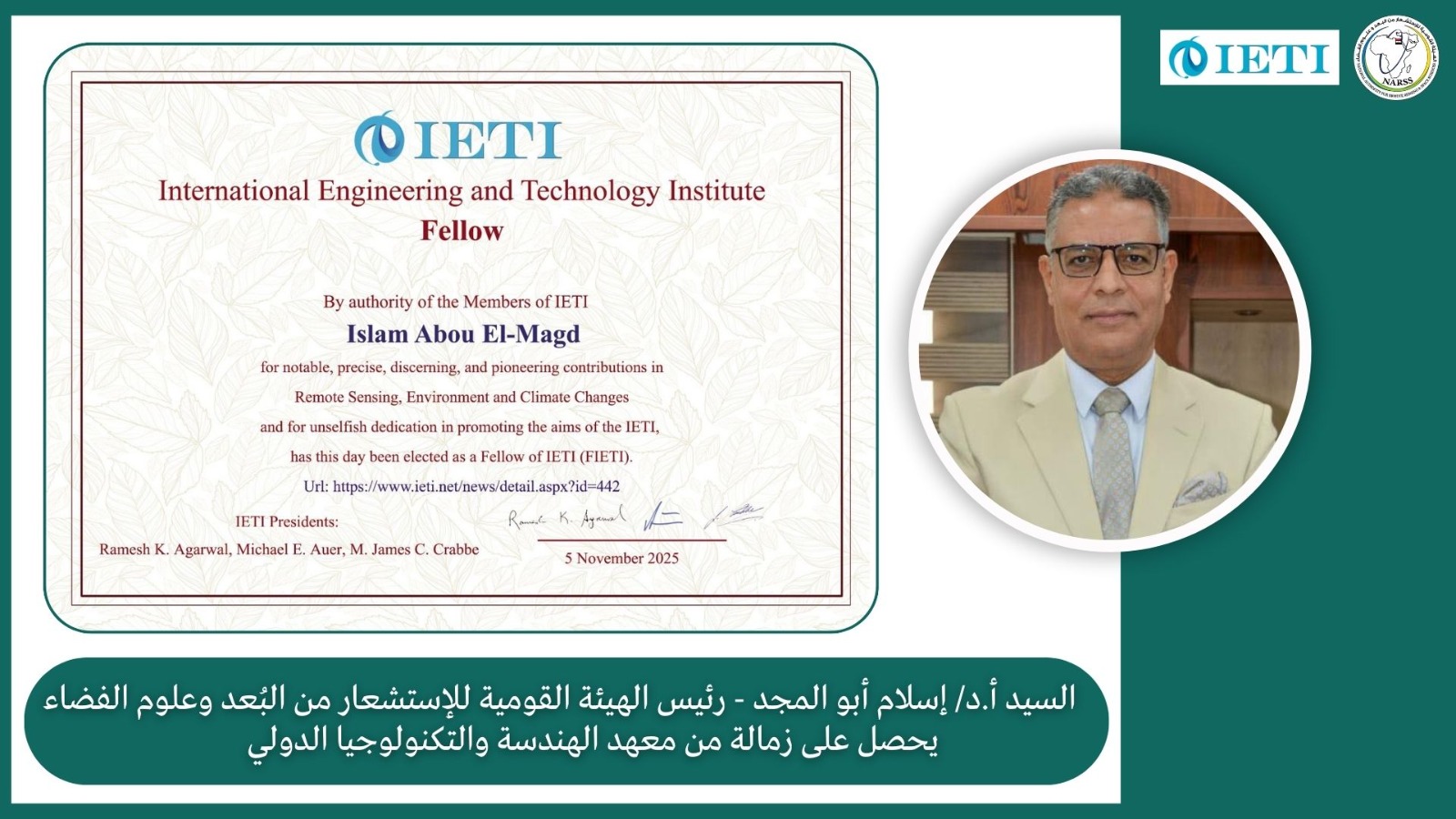 وقدم جميع منتسبي الهيئة القومية للاستشعار من البعد وعلوم الفضاء، خالص التهنئة للدكتور إسلام أبوالمجد على اختياره كزميل في المعهد الدولي للهندسة والتكنولوجيا، وتمنوا له دوام التوفيق والسداد خلال الفترة القادمة.
