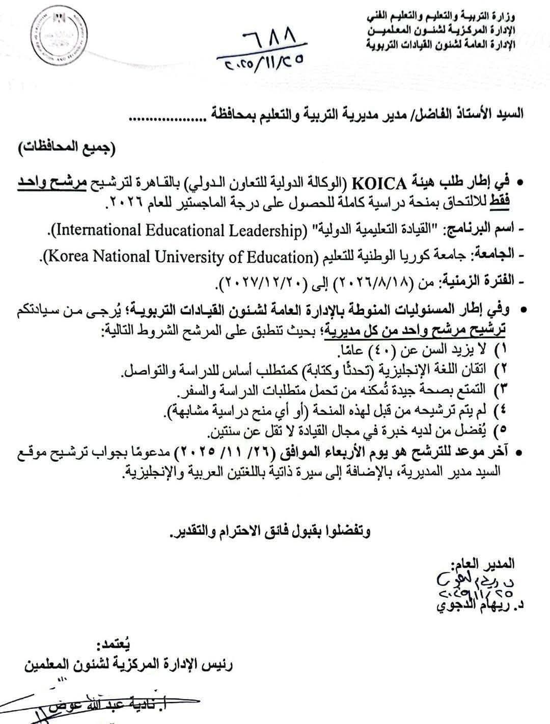 عممت وزارة التربية والتعليم خطابا على المديريات التعليمية في إطار طلب هيئة KOICA الوكالة الدولية للتعاون الدولي بالقاهرة لترشيح مرشح واحد فقط للالتحاق بمنحة دراسية كاملة للحصول على درجة الماجستير للعام ٢٠٢٦ )International Educational Leadership( “اسم البرنامج: “القيادة التعليمية الدولية -)Korea National University of Education( الجامعة جامعة كوريا الوطنية للتعليم -خلال الفترة الزمنية من (٢٠٢٥/۸/۱۸) إلى (۲۰۲۷/۱۲/۲۰).
