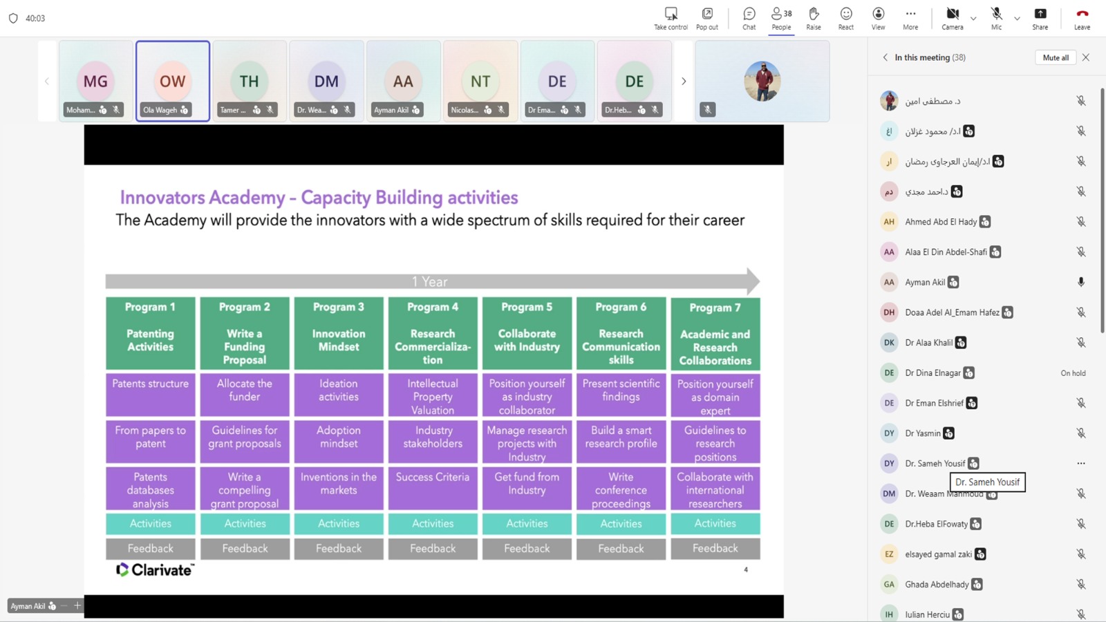 وخلال فعاليات الجلسة الافتتاحية، قدم الدكتور مصطفى أمين مدير برامج بالصندوق عرضًا تعريفيًّا حول منسقي الجامعات ودورهم في تعزيز منظومة الابتكار داخل المؤسسات الأكاديمية، كما قدم الدكتور أيمن عقيل ممثل شركة Clarivate عرضًا تفصيليًا حول خطة البرنامج وأهدافه وآليات تنفيذه داخل الجامعات، بحضور ممثلي 61 جامعة ومركزًا بحثيًّا من مختلف محافظات الجمهورية؛ بما يعكس حجم المشاركة والاهتمام بتعزيز بنية الابتكار في مصر.