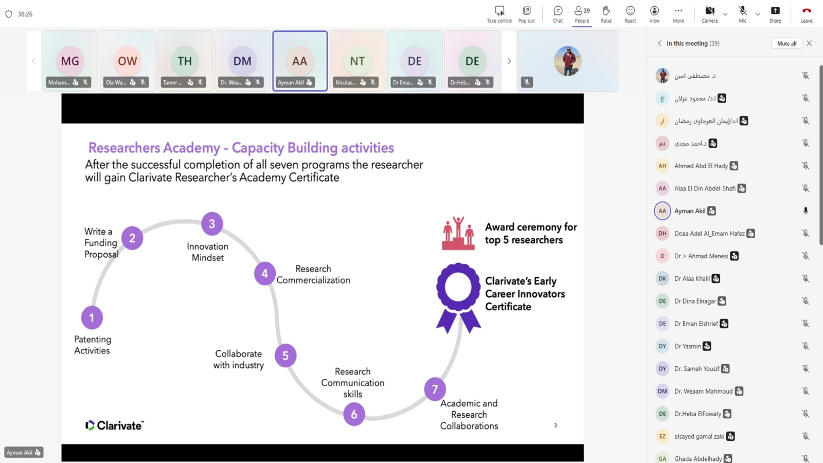 وشهدت الجلسة الافتتاحية حضور كل من الدكتورة جينا الفقي رئيس أكاديمية البحث العلمي والتكنولوجيا والمشرف العام على بنك المعرفة المصري، والدكتور تامر حمودة المدير التنفيذي لصندوق رعاية المبتكرين والنوابغ، والدكتورة وئام محمود المدير التنفيذي لوحدة الابتكار المؤسسي بوزارة التعليم العالي والبحث العلمي، وعلا لورانس مستشار بنك المعرفة المصري.