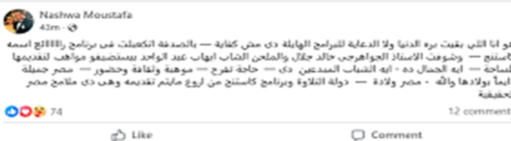 حرصت الفنانة نشوى مصطفى، على الإشادة ببرنامج دولة التلاوة، وبرنامج كاستينج، اللذان يتم عرضهما حاليا، عبر شاشات المتحدة، مشيرة بإعجابها الشديد بالمواهب الشباب المشاركة في العمل.