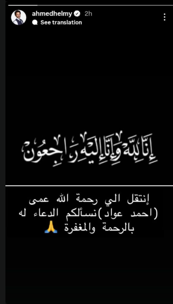 أعلن الفنان أحمد حلمي، منذ قليل عن وفاة عمه، بدون ذكر أي اسباب، داعيا الله ان يتغمده برحمته، وذلك عبر موقع الفيديوهات والصور القصيرة إنستجرام.