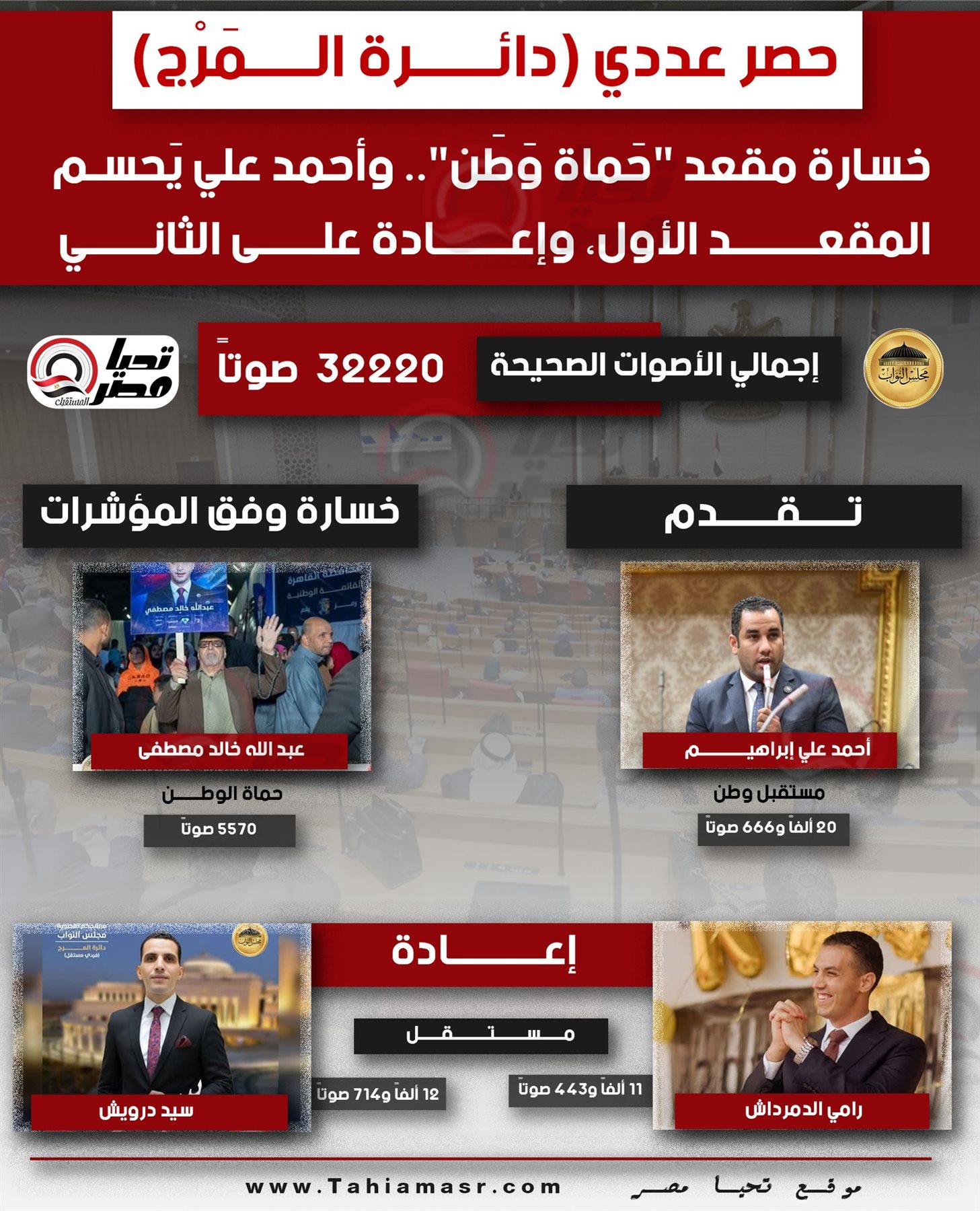 وأفا الحصر العددي بحصول مرشح حزب مستقبل وطن على 20.666 صوتًا في انتخابات مجلس النواب، بينما حصل المرشح المستقل رامي الدمرداش على 11.714 صوتًا، كما حصل المرشح المستقل الآخر سيد درويش على 12.714 صوتًا وستجرى بينهم جولة إعادة لتحديد المقعد الثانية المخصص للدائرة داخل البرلمان، بينما خسر مرشح حزب حماة الوطنت عبد الله خالد مصطفى الانتخابات بعدما حصل عبى 5570 صوتًا من إجمال عدد الأصوات الصحيحة الذي بلغ 32.220 ألف صوتًا.