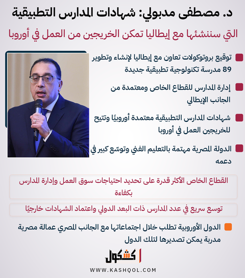وأضاف خلال المؤتمر الحكومي الأسبوعي، مساء الخميس، أن الدولة ستتيح تلك المدارس، فيما سيتولى القطاع الخاص المصري إدارتها، موضحًا أنها معتمدة من الجانب الإيطالي.