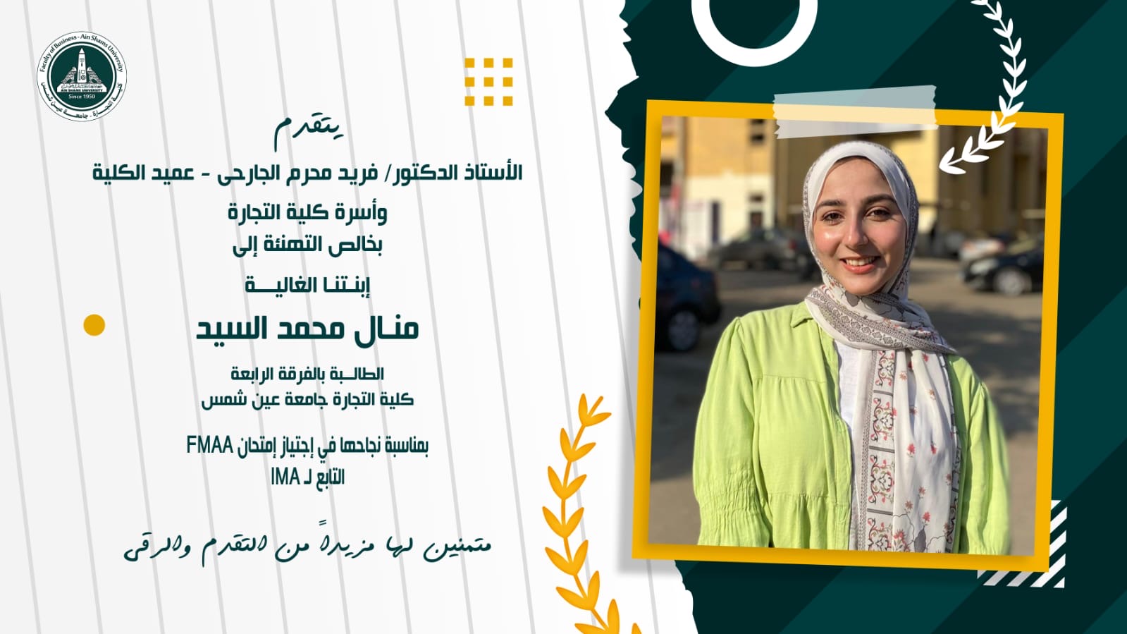 وقدمت كلية التجارة جامعة عين شمس بخالص التهنئة للطالبين المتفوقين، وتتمنى لهما دوام التوفيق والنجاح، وأن يكون هذا الإنجاز بداية لمستقبل مهني باهر، وحافزًا لبذل المزيد من الجهد لتحقيق الطموحات.