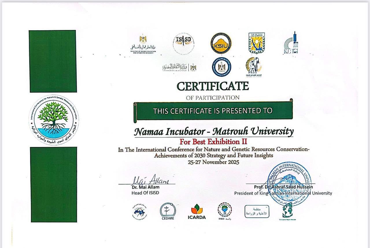 حاضنة «نماء» جامعة مطروح تحصد جائزة أفضل عارض بمؤتمر صون الطبيعة