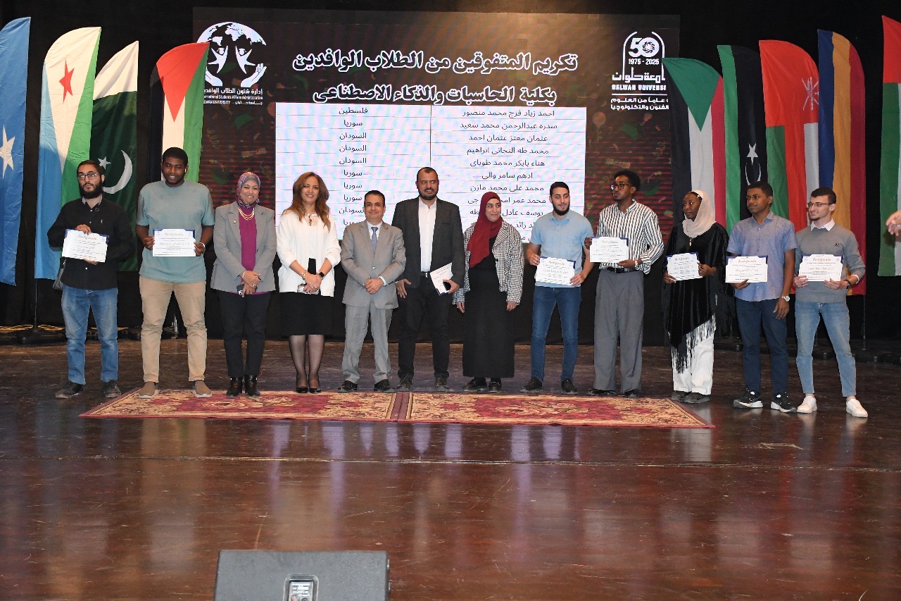 نظّمت جامعة حلوان احتفالية كبيرة لاستقبال الطلاب الوافدين الجدد وتكريم المتفوقين والخريجين، في أجواء احتفالية عكست القيمة العلمية والإنسانية للجامعة التي تعد بيتًا ثانيًا لآلاف الطلاب من مختلف الجنسيات، أقيم الحفل تحت رعاية الدكتور السيد قنديل رئيس جامعة حلوان، والدكتور عماد ابو الدهب نائب رئيس الجامعة للدراسات العليا والبحث العلمي، كما حضر الحفل الدكتور حسام رفاعي نائب رئيس الجامعة لشئون التعليم والطلاب، والدكتور وليد السروجي نائب رئيس الجامعة لشئون خدمة المجتمع وتنمية البيئة، ولفيف من عمداء الكليات وأعضاء هيئة التدريس بالجامعة، وقد شهد الحفل حضور مجموعة من القيادات الأكاديمية والدبلوماسية، من بينهم: الدكتور أحمد عبد الغني رئيس الإدارة المركزية لشئون الطلاب الوافدين بوزارة التعليم العالي والبحث العلمي، والدكتور خالد عبد العزيز المحارب رئيس المكتب الثقافي الكويتي، والدكتور سليم التلولي مسئول الجامعات بسفارة دولة فلسطين، والدكتور عاصم أحمد حسن المستشار الثقافي لسفارة جمهورية السودان، والدكتور هادي الصبان الملحق الثقافي بسفارة الجمهورية اليمنية.