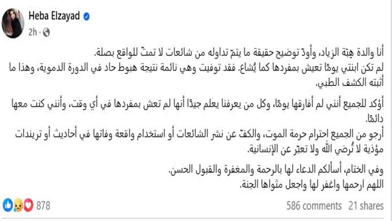 والدة هبة الزياد تنفي شائعات حول وفاتها