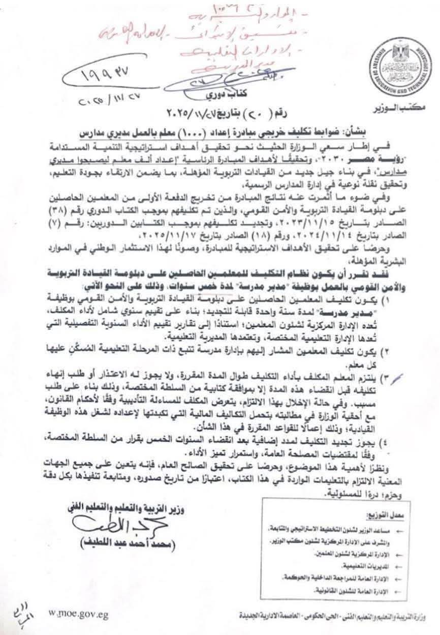 قررت وزارة التربية والتعليم والتعليم الفني،  أن يكون نظام التكليف للمعلمين الحاصلين على دبلومة القيادة التربوية والأمن القومي بالعمل بوظيفة مدير مدرسة لمدة خمس سنوات، وفقا الضوابط التالية: