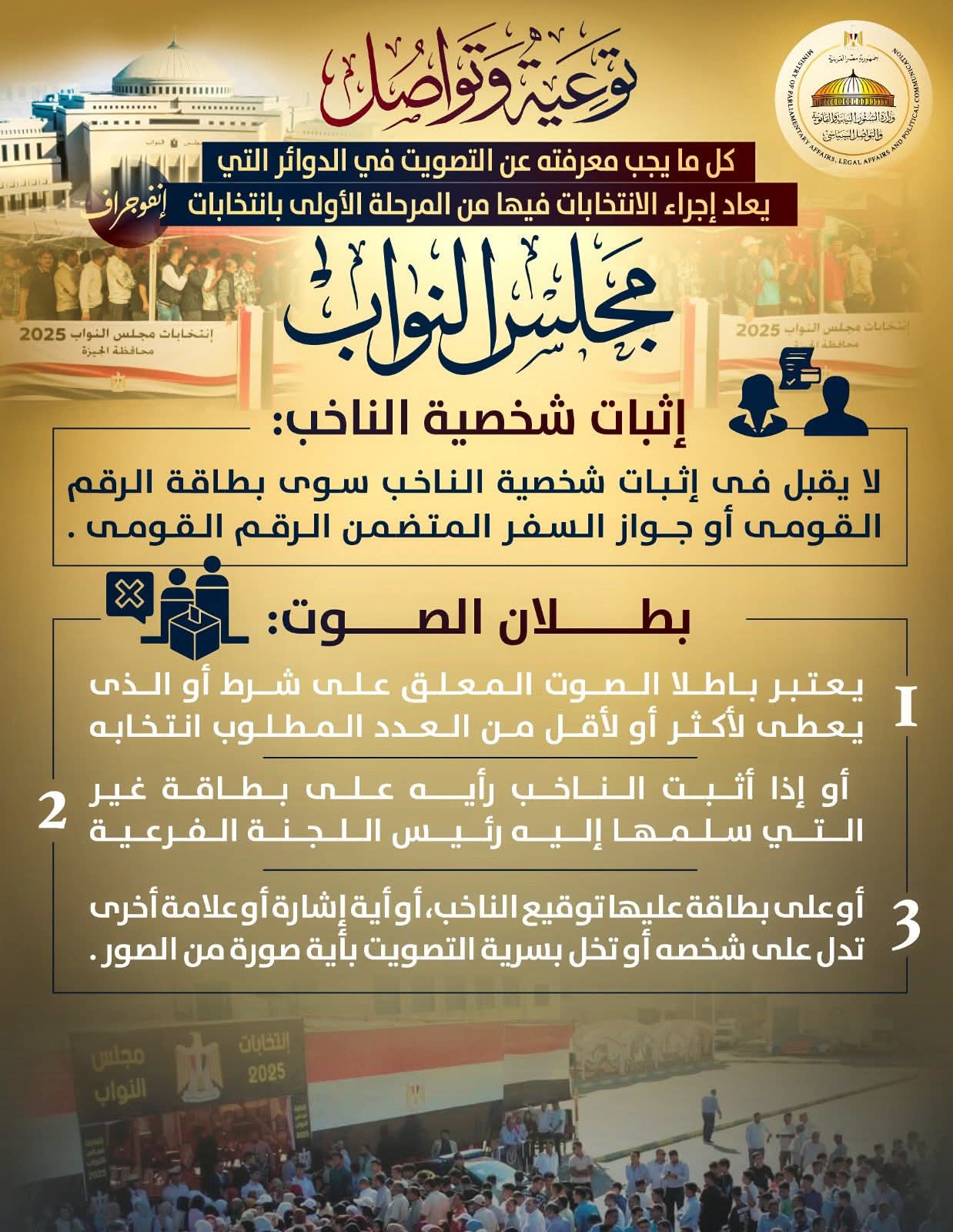 نشرت وزارة الشئون النيابية والقانونية والتواصل السياسي إنوجرافا توعويًا يوضح أبرز المعلومات التي يجب أن يعرفها الناخبون بشأن التصويت في الدوائر التي تقررت فيها إعادة إجراء الانتخابات بالمرحلة الأولى من انتخابات مجلس النواب 2025، وذلك في إطار حرص الوزارة على تعزيز الوعي الانتخابي لدى المواطنين.